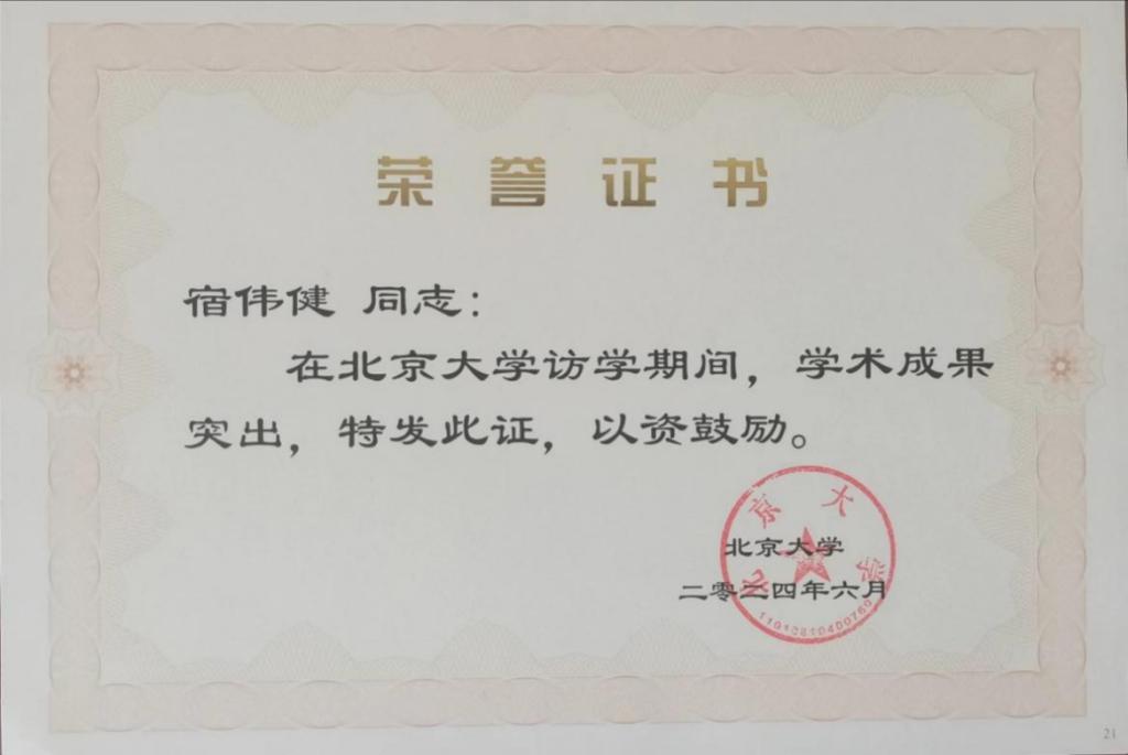 宿伟健副教授获评北京大学访问学者“学术成果突出奖”。