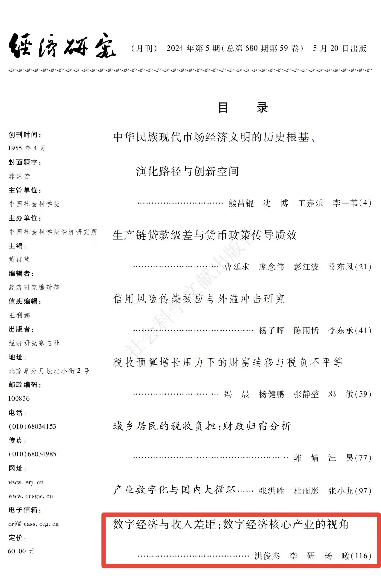 研究院院长洪俊杰教授与对外经济贸易大学博士研究生李研和杨曦合作撰写的论文《数字经济与收入差距:数字经济核心产业的视角》在《经济研究》2024年第5期发表。该刊为我校特类期刊。