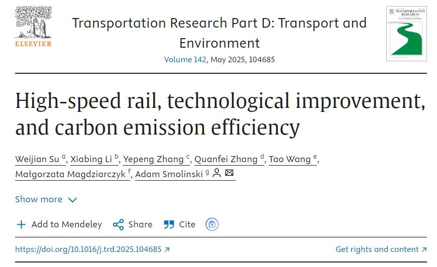中国经济研究院宿伟健副教授(第一作者)与合作者撰写的论文“High-speed rail, technological improvement, and carbon emission efficiency” 在国际期刊《Transportation Research Part D: Transport and Environment》上发表。该期刊为SSCI一区、中科院一区TOP期刊,在Association of Business School (ABS)期刊评级为3星,我校新版期刊目录中的A1类期刊。